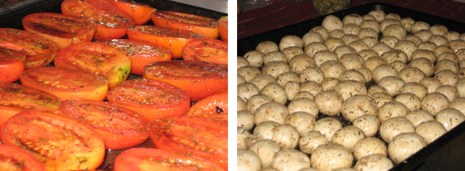 Slice the tomatoes in half lengthwise. Toss with olive oil, balsamic vinegar, salt/pepper/thyme. Arrange cut side up on a baking sheet in a single layer. Drizzle with a little honey.