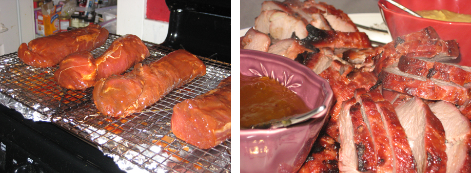 * I found this recipe as part of a menu for a Mad Men party, and they suggested serving the pork tucked into charmingly retro King’s Hawaiian Rolls.  I was vaguely astonished that I could actually find that particular brand of roll and bought a pack before I really processed what I was doing.  However, staring at them the next day they reminded me disturbingly of the dinner rolls that they served in my elementary school cafeteria, so I also invested in some fresh brioche slider rolls from Iggys.  I think any kind of small soft-ish roll will do, something with a little sweetness to it is a nice pairing with the caramelized marinade on the pork.  I ran both kinds of rolls under the broiler to toast them up before serving.