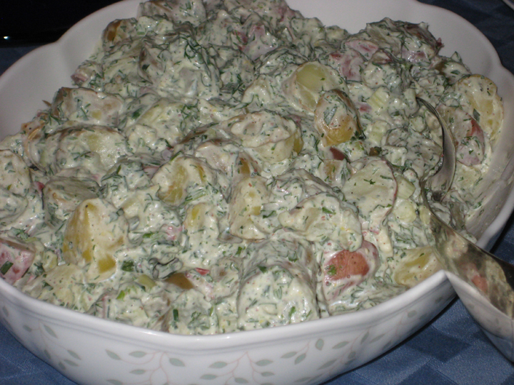 Dinner this week started with my craving for creamy potato salad, and expanded outwards from that point.