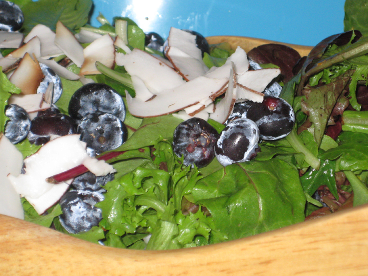 With an orange vinaigrette + blueberries (because they’re in season now) + leftover coconut from last week’s Dinner.