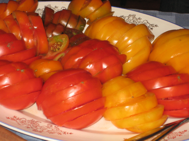 Vine ripe summer tomatoes bursting with flavor. Get a range of varieties – I got a a few each of Carbons, Pineapples, Flammes, Genoveses, and some just good old fashioned red field tomatoes.