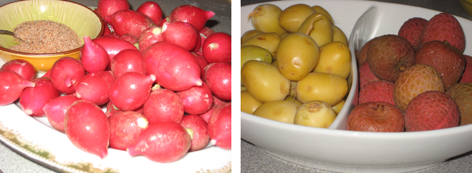 I stopped by one of the many area Indian/Pakistani/Bangledeshi grocery stores on Sunday in search of pomegranates. They didn’t have any pomegranates, but they did have lychees for $3/lb which I eagerly sorted through. This was not the product I bought just because. I grew up eating lychees, and love them (not everyone at Dinner agreed with me). They also had a box full of strange yellow fruit on a branch. I stared at it as I picked lychees, trying to decide what it was. I finally gave up and asked, and was told that they were fresh dates. I was fascinated, I have always wondered what fresh dates taste like.