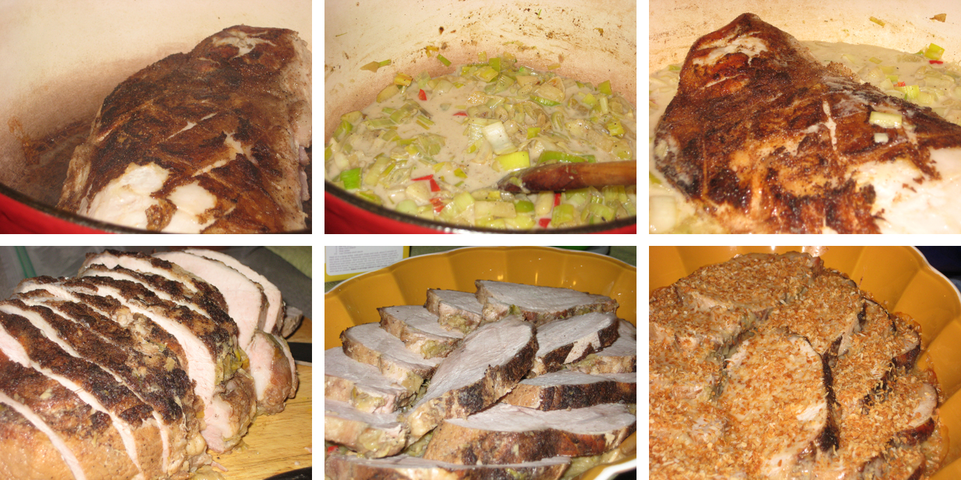 The next day, slice the pork into ¼” thick slices and arrange on top of the leeks in the baking dish.