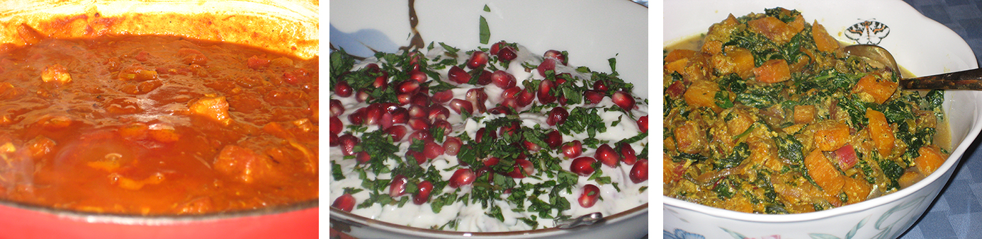 Sometimes I use the Dinner after Thanksgiving to dispose of any lingering Thankgiving leftovers lurking in my kitchen. However, this year we went out for Thanksgiving dinner, so I had no leftovers to creatively repurpose. So, I indulged myself by making the spicy-tomatoey wildly inauthentic chicken curry I’ve been craving for several weeks, and pairing it with my favorite buttermilk based saag recipe made with chard and kale. Possibly I pleased myself in this meal more than I pleased the rest of Dinner, but sometimes I get to be a little self-indulgent. I promise next week will be tamer.