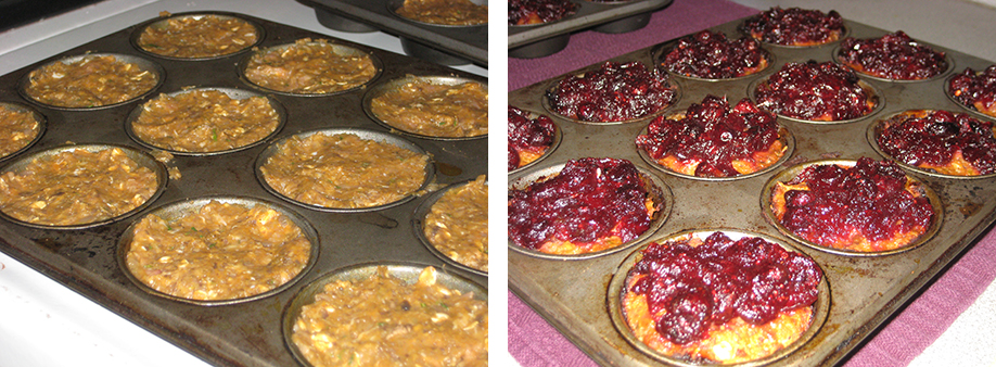 Remove from the oven and spoon a generous tablespoon of cranberry sauce over the top of each muffin. Return the pan to the oven and continue to bake for 15 minutes.