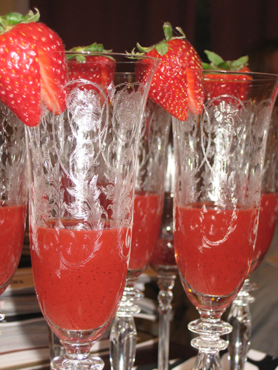 To serve measure 1 oz (2 Tbsp) of the rhubarb-ginger syrup into a champagne glass, and then top with champagne. Garnish with a strawberry if you’re feeling fancy.
