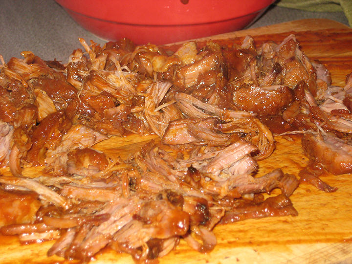 When the pork is tender remove from the sauce with a slotted spoon (if you can lift it out of the pork with a fork it’s not tender enough yet). Shred the pork with two forks into long strands, and then add it back to the cooking liquid and stir gently to coat. Add more of the peach bourbon barbeque sauce to taste, and serve the rest on the side.