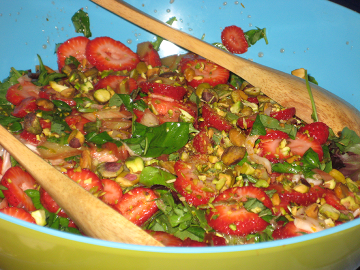 Toss the arugula with a light salad dressing (I used an orange-balsamic dressing I had in the fridge). Arrange the drained strawberry-rhubarb mixture over the top, and then sprinkle with the chopped pistachios.