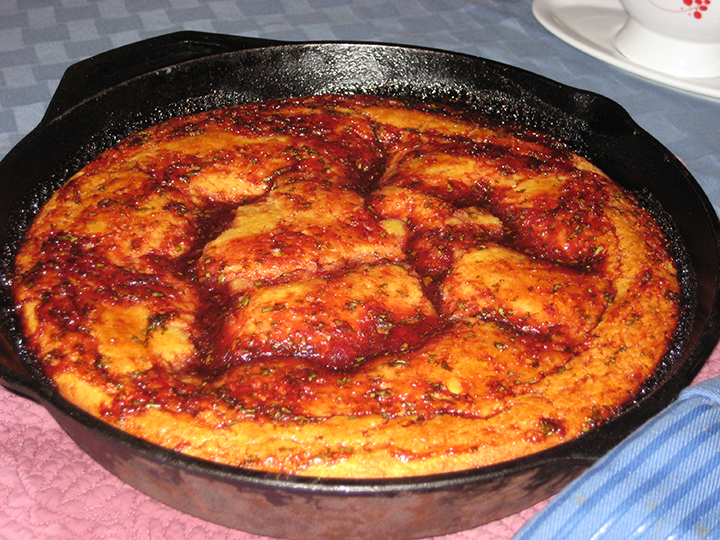 I defrosted some carefully hoarded Strawberry-Pomegranate Jam from last year and minced up some basil to stir into it for a slightly savory edge.