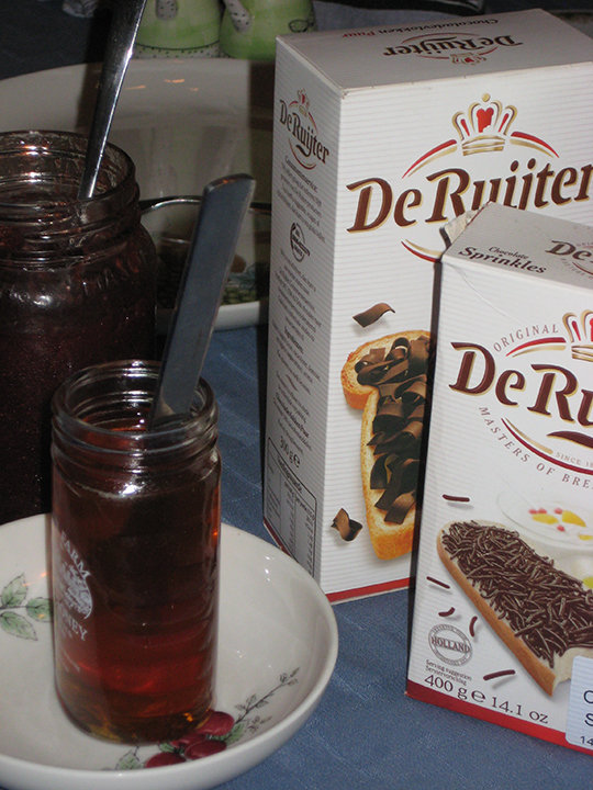I have heard that in this hedonistic modern era people sometimes substitute peanut butter (pindakaas – literally peanut cheese – which the Dutch are quite partial to, unlike most of the rest of Europe which does not share the American obsession with peanut butter) for the butter. While I am sure my father is making a horrified face right now at the very idea, I think sounds like an excellent, if decadent, idea.
