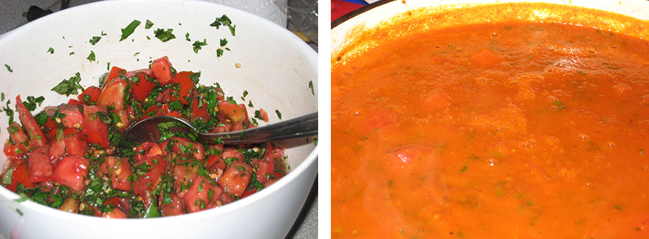 Add to the soup and cook for 5 minutes to heat through (but not more than that, you want the fresh taste of the tomatoes to come through).