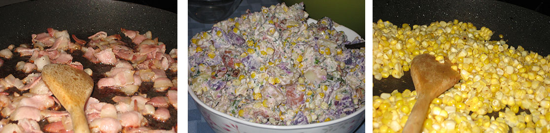 Add the corn and bacon to the potatoes and toss with enough of the sauce to coat everything generously without getting gloppy. Season to taste with salt/pepper.